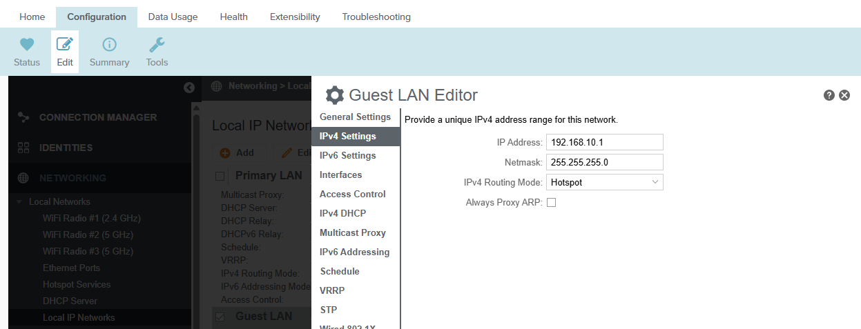 Then go to Local Networks > Local IP Networks. Select Guest LAN and click Edit. In IPv4 Settings set IPv4 Routing Mode to Hotspot. Save and Commit.