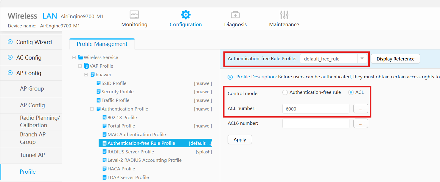 - Authentication-Free rule will be configured in Configuration > AP Config > Profile > Wireless Service > VAP Profile > profile > Authentication Profile > Authentication-free Rule Profile: