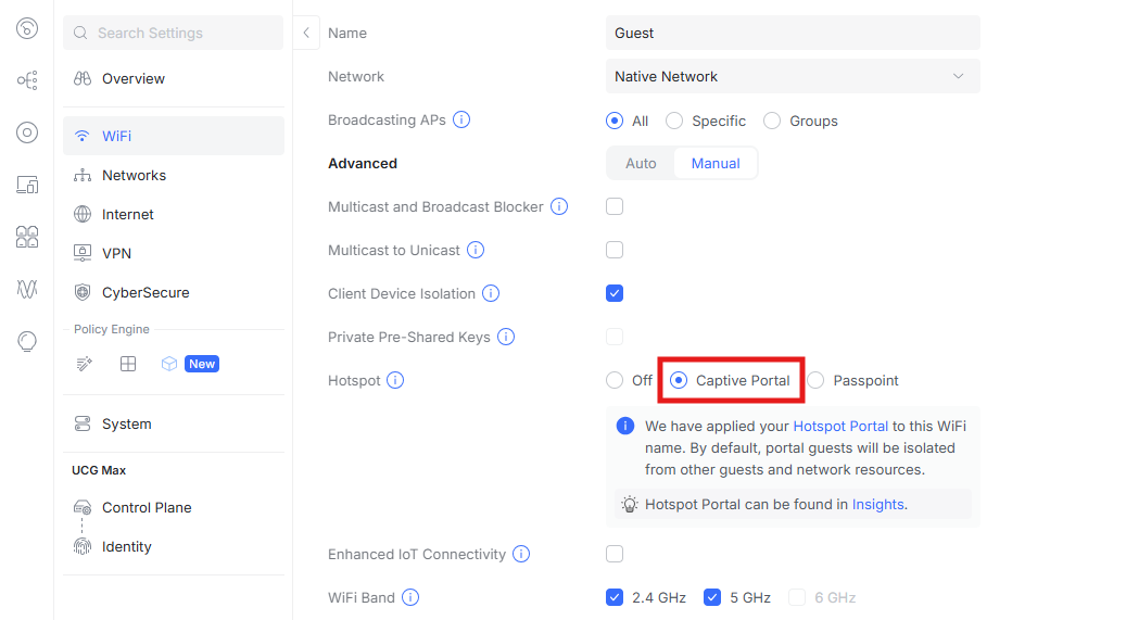 Finally, go to Settings > WiFi and select your guest Wi-Fi network. Enable Captive Portal option in Hotspot section.